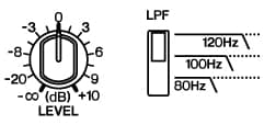 (2) Ajuste o nível do subwoofer DXS15. Ajuste as chaves LPF (filtro passa-baixas) do DXS15 para que correspondam às configurações das chaves HPF (filtro passa-altas) do DXR12.