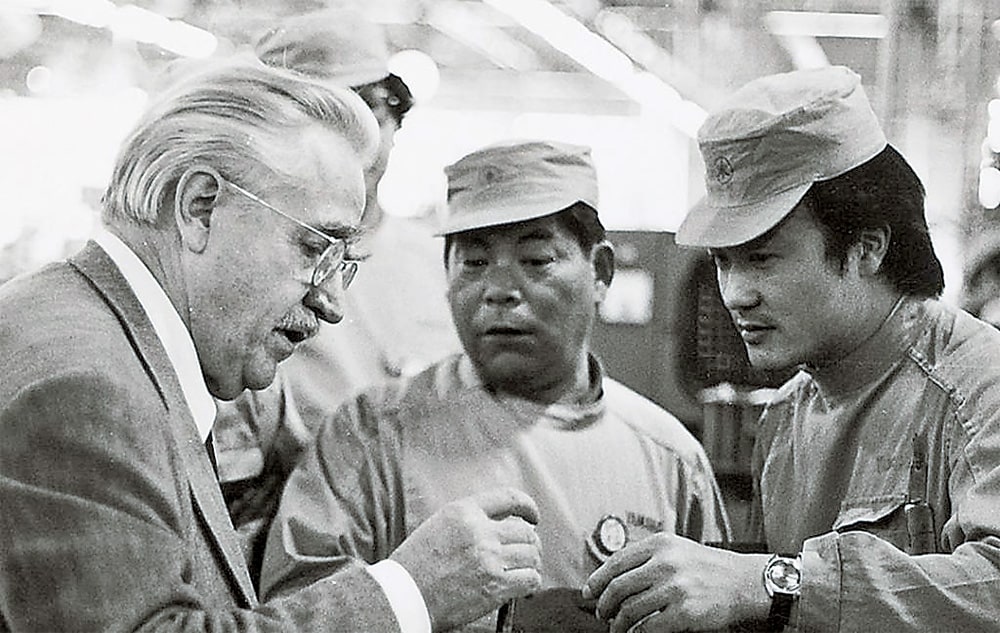 Schilke realiza controle de qualidade na fábrica de Toyooka enquanto Kawasaki (direita) observa (1970).
