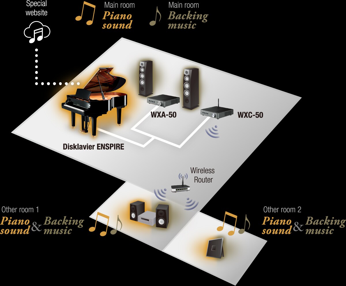 The music for the Disklavier ENSPIRE is composed of two completely independent recordings — the piano and the backing parts. Either part can be played back or output separately. For example, you can simultaneously play the sound of the piano part as an automatic performance on the Disklavier ENSPIRE itself, while playing the sound of the backing music through connection to the WXA-50. And in rooms out of the sonic reach of the Disklavier ENSPIRE, you can have the entire performance — both piano and backing — sent to and played in other rooms using the WXC-50.