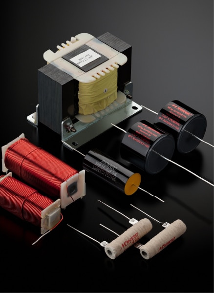 All drivers in the NS-5000 are connected in positive phase with single wiring to deliver a natural, pleasing listening experience. Components of its crossover network are mounted on a double-sided printed circuit board with extra-thick copper traces of 140 μ in thickness; a shorter signal path on the circuit board minimises the loss of sound data during transmission. Moreover, in order to minimise signal loss, we used for the network handpicked parts of only the highest quality, such as the MCap SUPREME EVO audio capacitor, which is made by Mundorf of Germany and renowned as the pinnacle of audio-use capacitor, Mundorf’s MResist SUPREME attenuator, and a woofer coil that weighs as much as 1.6 kg (3.52 lbs.).