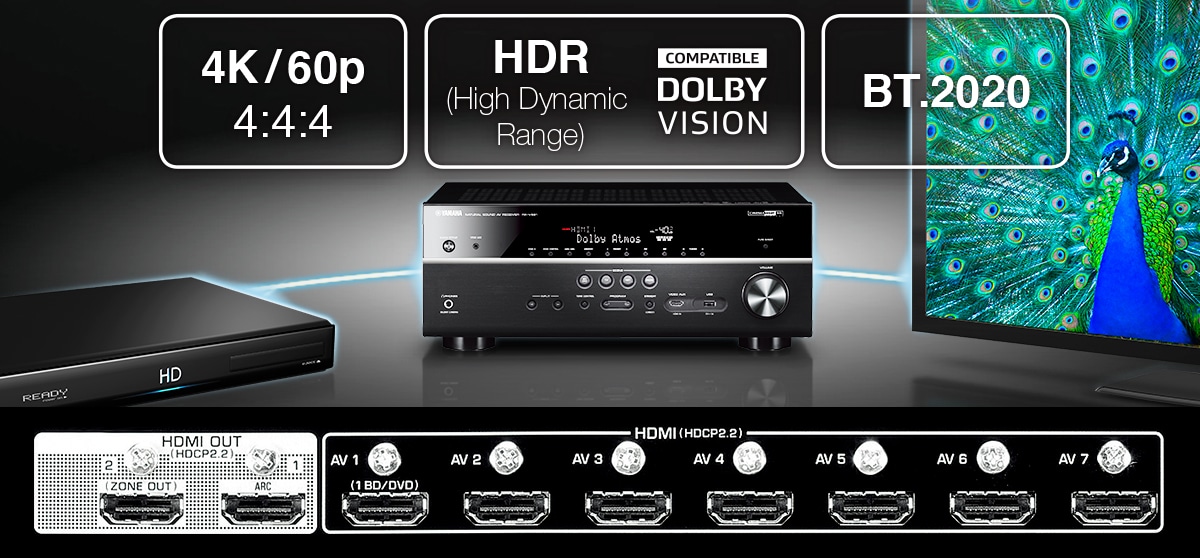- HDMI® (8 in / 2 out) 4K Ultra HD Full Support with 4K/60p, 4:4:4, HDCP2.2 (7 in / 2 out), HDR Video e BT.2020