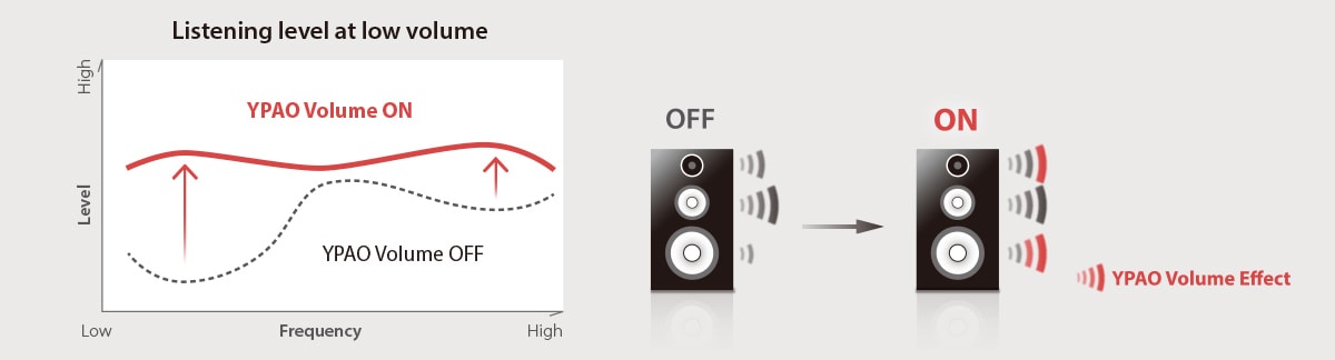 Os ouvidos humanos são menos sensíveis às frequências altas e baixas, especialmente em volumes menores. YPAO Volume aplica correções automáticas na equalização, ajustando essas frequências de acordo com a mudança de volume. Aplicando os resultados obtidos pelo YPAO Volume, a equalização é otimizada no sistema e no ambiente.