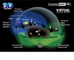 CINEMA DSP 3D gera um campo sonoro amplo e denso. A decodificação de formatos de áudio HD permite o aproveitamento de sinais de áudio HD. A função Virtual Presence Speaker produz som tridimensional sem o uso de alto-falantes de presença reais.