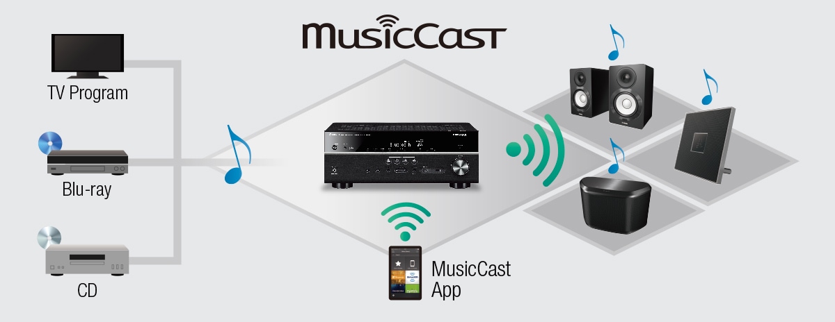 MusicCast é uma nova revolução em envio de músicas utilizando todos seus produtos MusicCast juntos ou separados, sendo controlados através de um simples aplicativo, criado para ser intuitivo, rápido e simples de ser usado. Utilize um sound bar, caixas acústicas sem fio, Receiver AV, seja qual for sua necessidade, combine e expanda seu sistema MusicCast.