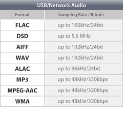 - Reprodução DSD 2.8MHz / 5.6MHz, FLAC/WAV / AIFF 192kHz / 24bit, Apple Lossless 96kHz / 24-bit