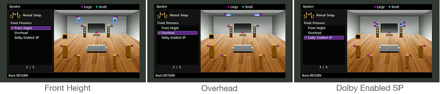 Yamaha fornece padrões de múltiplo posicionamento para caixas de presença que suportam Dolby Atmos, criando um campo sonoro ideal para seu sistema. Qualquer tipo de ambiente pode ser reproduzido, incluindo o espaço tridimensional de CINEMA DSP assim como Dolby Atmos.