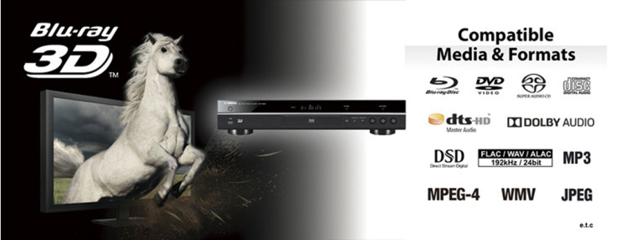 Este Blu-ray Player suporta reprodução de discos em Blu-ray 3D™, bem como de discos SACD e DVD. Ele é compatível com os formatos de som surround Dolby® True HD e DTS-HD Master Audio™. Além disso, para uso de rede, ele pode manipular formatos de áudio de alta resolução FLAC, ALAC 192 kHz / 24bits e DSD 5.6 MHz. Você pode curtir uma grande variedade de conteúdo de áudio e vídeo apenas com este player.