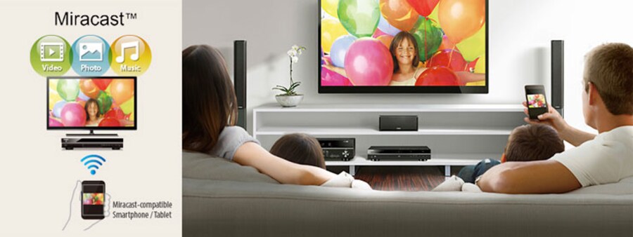 Este Blu-ray Disc Player é compatível com Miracast, um padrão wireless que permite conexão com tablets ou smatphones com esta tecnologia, permitindo espelhar vídeos e fotos do reprodutor para que toda a família possa ver o conteúdo na tela da TV. Quando utilizado com os receivers AV Yamaha, o conteúdo ainda poderá ser reproduzido com áudio dinâmico.