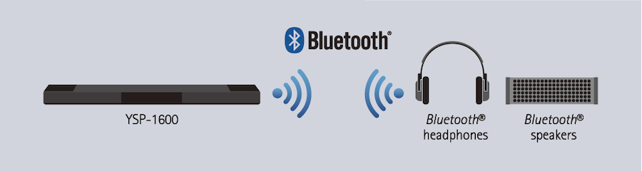 O YSP-1600 é equipado com a última tecnologia Bluetooth, fazendo a conexão sem fio ainda mais conveniente. Você pode reproduzir músicas através do YSP-1600 para headphones Bluetooth ou caixas Bluetooth.