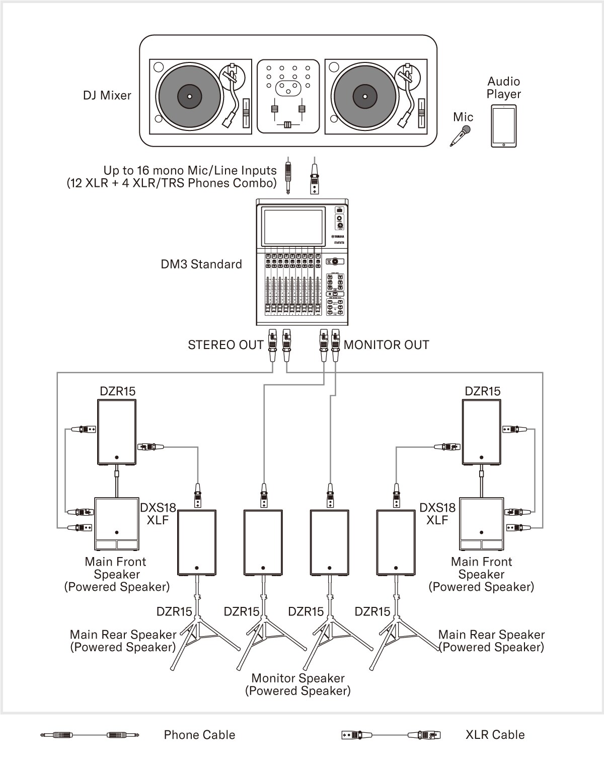- Mixer de 16 canais, quatro caixas acústicas amplificados e dois subwoofers para cobertura do público, além de duas caixas acústicass amplificados para monitoramento do DJ. [Console de mixagem DM3 Standard].