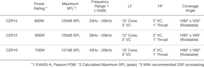 • The CZR Series features 15˝, 12˝ and 10˝ models with transducers with die-cast aluminum frames with a 3˝ voice coil for very high power input, and a lightweight yet powerful neodymium magnet that helps to add punch and power to your bass. The HF unit achieves vivid, soaring highs from its titanium diaphragm with a 2˝ voice coil and neodymium magnet. Like the DZR, the CZR models also feature the rotatable constant directivity horn design (90°x 50° for the CZR15, and 90°x 60° for the CZR12 and CZR10) for increased flexibility in mounting vertically or horizontally.