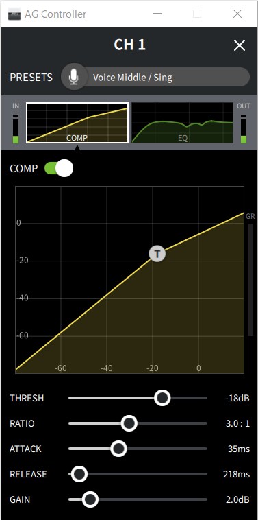 AG Controller é um software que permite controlar as funções DSP do AG03MK2, AG06MK2, AG03, AG06 e AG01 do seu dispositivo Windows / Mac / iOS via conexão USB.