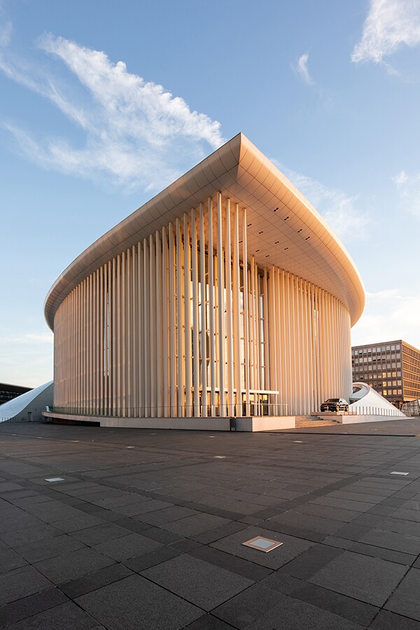 Com plateia inclinada e quatro "torres" de cada lado, o Grande Auditório da Filarmônica de Luxemburgo comporta 1.328 pessoas e combina a acústica das clássicas salas de concerto estilo "caixa de sapato" com a atmosfera do teatro shakespeareano. Menor, a Salle de Musique de Chambre tem paredes curvas e comporta 313 pessoas, enquanto os quatro foyers do local também podem ser usados para apresentações.