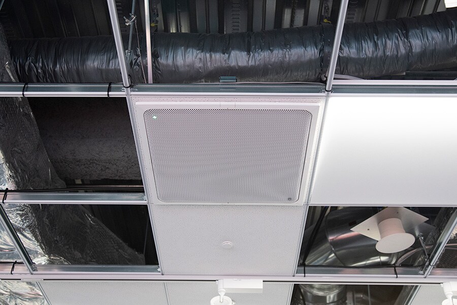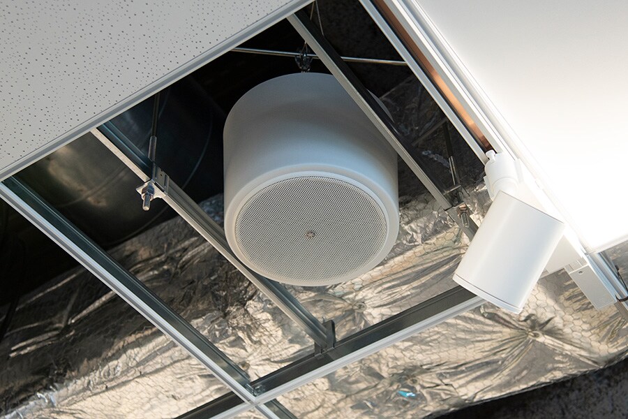 No Espaço Aberto de Inovação, as colunas e o microfone do sistema ADECIA estão instalados no teto.