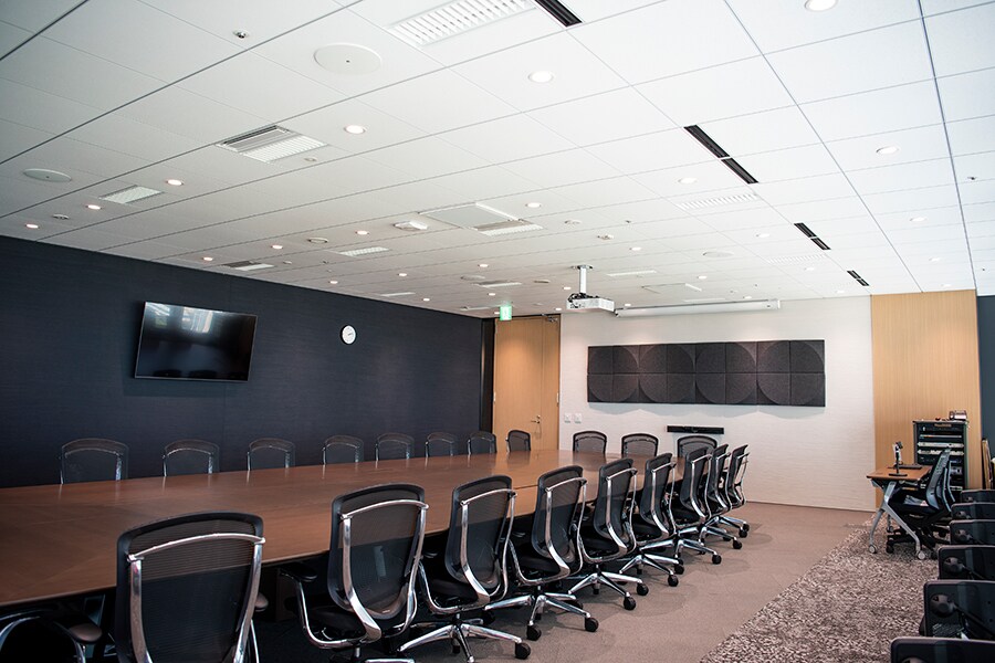 Dois sistemas de microfones de teto RM-CG instalados na parte frontal e traseira do teto da sala de reuniões do conselho de administração.