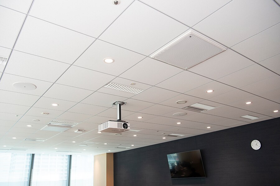 Sr. Takeyama: Bem, para começar, escolhi estas colunas por causa do seu aspeto. Selecionei colunas de teto que são instaladas no mesmo para que as pessoas na sala de conferências não se sintam intimidadas pelo equipamento de áudio. Além disso, as colunas de teto oferecem uma reprodução uniforme na sala, concebendo a sua localização de instalação. Ao utilizar o microfone de teto e as colunas de teto, as pessoas que participam na conferência web desfrutarão do mesmo ambiente de captação e reprodução de som, independentemente do local onde estejam sentadas, seja à cabeça ou ao fundo da mesa.