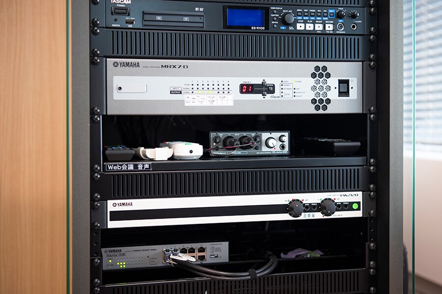 Sr. Takeyama: Não estavam apenas a solicitar um sistema de conferência remota, mas também a amplificação de um microfone de mão durante reuniões e seminários regulares, e a amplificação de várias fontes de entrada, incluindo o áudio do computador utilizado durante uma apresentação e o áudio do leitor Blu-ray. Devido a esses pedidos específicos, achei melhor adotar o processador de sinal "MRX7-D" porque é um sistema flexível configurado para suportar tais aplicações. Particularmente quando se amplifica utilizando um microfone de mão durante uma conferência web, é quase impossível eliminar completamente algum eco e feedback, pelo que a funcionalidade de cancelamento de eco e do supressor de feedback incorporado no "MRX7-D" oferece um ambiente de conferência web confortável e sem constrangimentos.