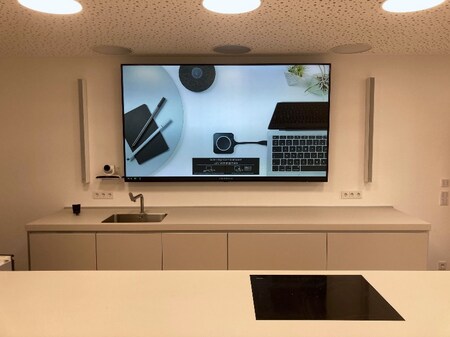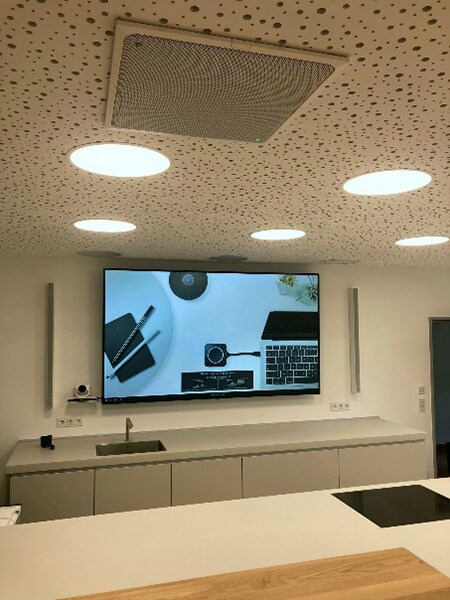 Com a solução de microfone de teto ADECIA, os oradores podem ser facilmente captados com um som natural durante as reuniões, bem como durante as demonstrações na cozinha, e também permanecem sempre claramente inteligíveis para a parte recetora - independentemente da sua localização. Além disso, as colunas “line array” reproduzem o discurso do lado remoto com a melhor qualidade e volume. O microfone de teto permanece visualmente discreto. As colunas brancas, que são alimentados por PoE, misturam-se perfeitamente com o ambiente da sala. Com o microfone de teto, todos os participantes na sala podem ser gravados, uma vez que cobre completamente a sala de reuniões e a cozinha de demonstração. A otimização automática do som da ADECIA e o conveniente procedimento de calibração também tornaram a entrada em funcionamento particularmente fácil. Permitem um som ótimo mesmo sem alterações estruturais, por exemplo, através de elementos sonoros adicionais. A fácil configuração e calibração do sistema torna possível fazer grandes alterações na decoração da sala e ainda obter a melhor qualidade de som sem a necessidade de ter um perito em som por perto.