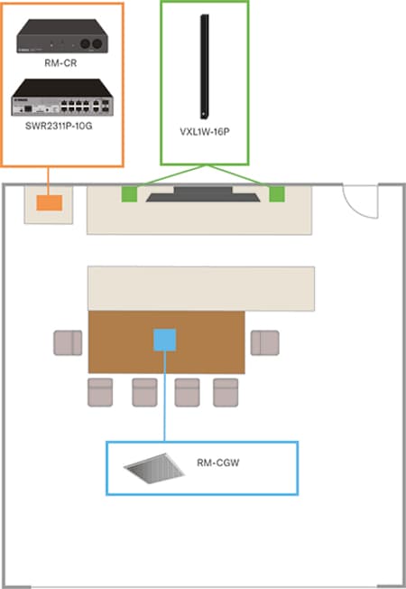 É utilizada uma combinação de um processador de conferência remota RM-CR, colunas “line array” Yamaha VXL1W16P DANTE PoE, um switch de rede Yamaha SWR2311P10G L2 e a unidade de microfone de teto RM-CG da Yamaha. Juntos formam a solução de teto ADECIA.