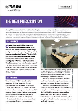 A Chugai Pharmaceutical Co., Ltd é uma das principais desenvolvedoras e fabricantes japonesas de medicamentos prescritos, que instalou recentemente a soundbar de vídeo CS-800 da Yamaha na sua sede em Tóquio. Ao usar a mais recente tecnologia de conferência remota da Yamaha, a empresa assegura que todos os participantes possam se preocupar totalmente com o conteúdo das reuniões.