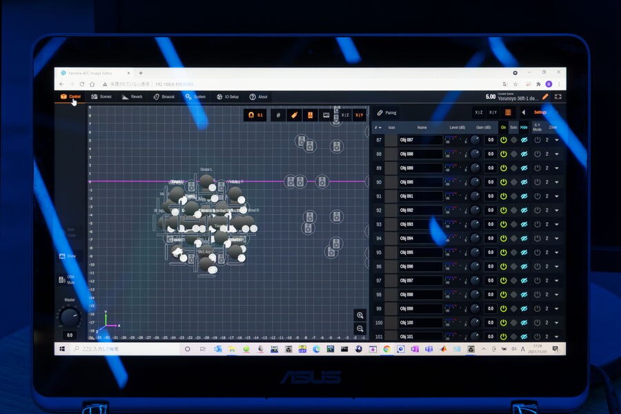 Para o segundo Yorunoyo, criei músicas com o AFC Image desde o início. Movi ainda mais a imagem sonora de acordo com o conceito de “FLOW - Going Around”. Pensei na localização tridimensional e no posicionamento dos alto-falantes desde a fase de composição, por exemplo, “Vamos balançar para L aqui” ou “Vamos mover o som do violino dessa forma no espaço”, e assim por diante. Os PANs e outros componentes do AFC Image responderam à música de maneira direta, facilitando a criação de uma imagem sonora tridimensional. Eu queria criar a música em grande escala, por isso foi benéfico que o número de objetos AFC fosse aumentado em relação ao evento anterior para um máximo de 128 canais. Desta vez, temos mais de 120 canais para fontes de som, incluindo gravações de quarteto, música digital e microfones de ambiente, que foram combinados em 80 canais por meio de stemming. Depois de reproduzi-la no Cross Dome, fizemos alguns pequenos ajustes, como adicionar um kick e separar a faixa do violino para dar mais amplitude.