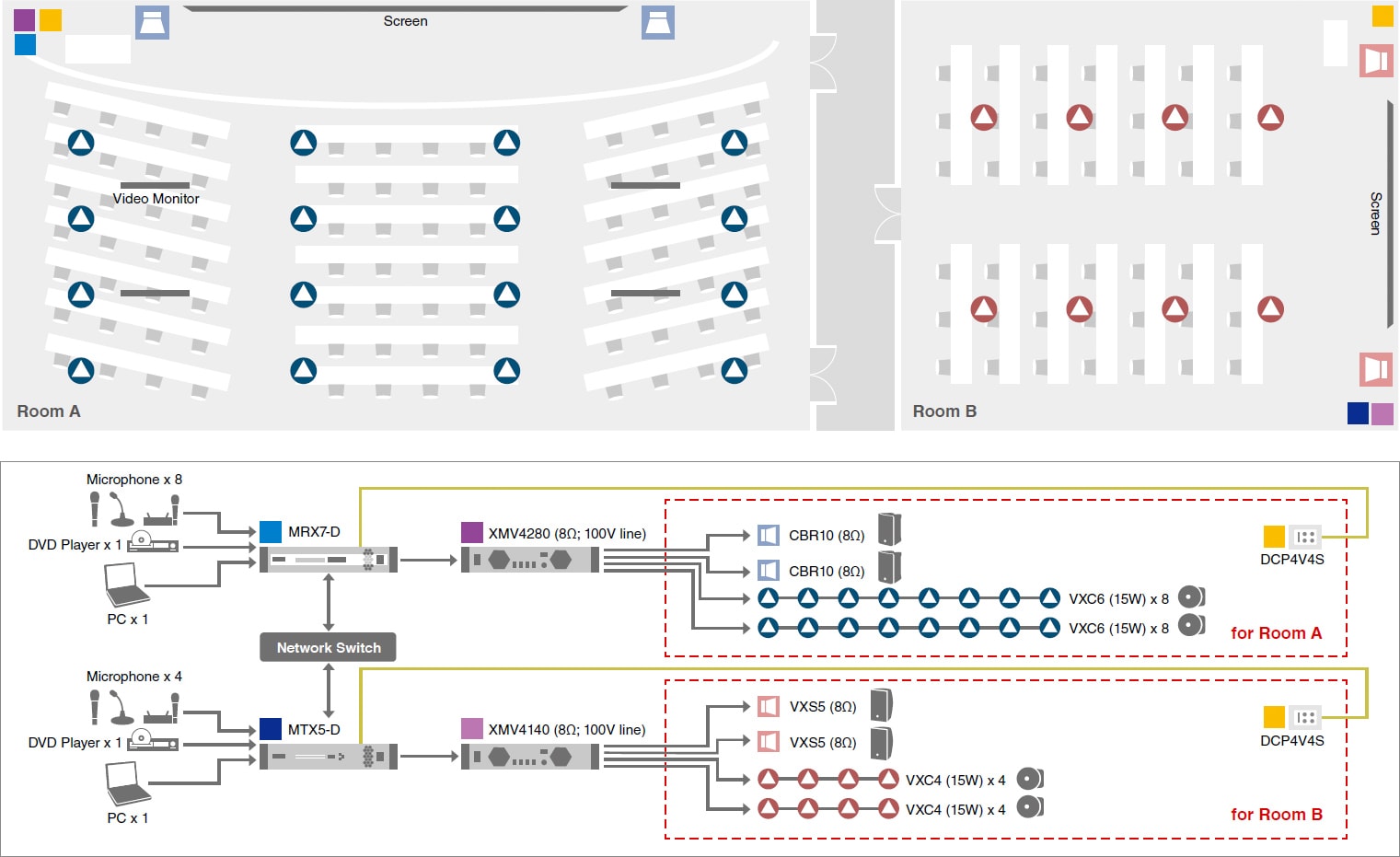 DCP4V4S control panels installed in each room allow remote control of audio source and microphone levels as well as on/off switching.