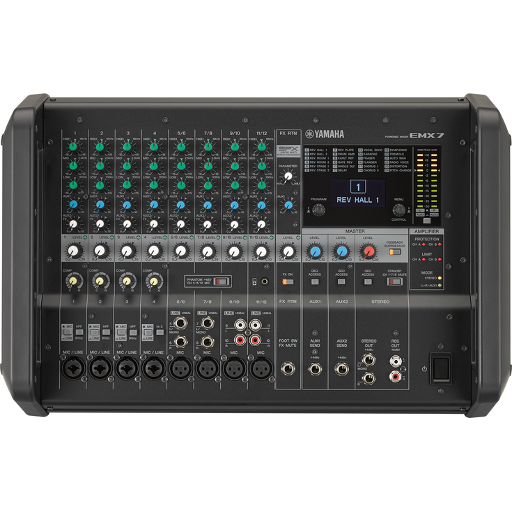 Mixer robusto e portátil amplificado de alta eficiência (710W), com efeitos abrangentes, Equalizador gráfico Flex 9, predefinição de alto falante e eliminador de microfonias nativo.