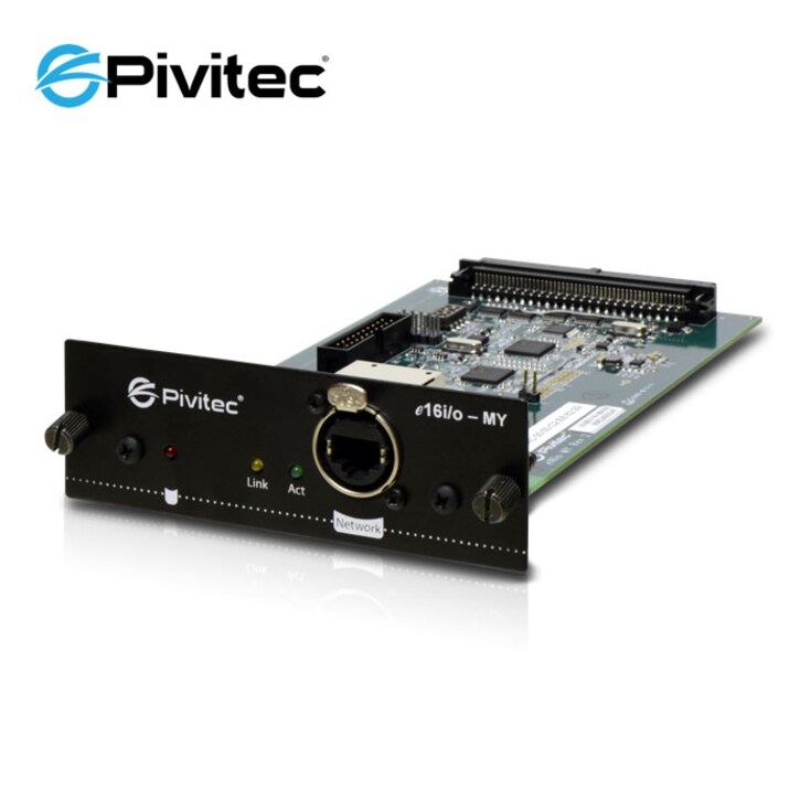 O Pivitec e16i/o-MY 16 é uma placa de interface de rede bidirecional Mini-YGDAI de 16 canais para consoles digitais Yamaha.
