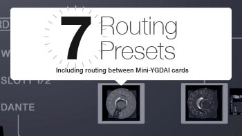 Para tornar o RSio64-D ainda mais conveniente e fácil de utilizar enquanto router e conversor de formatos, vêm integradas no equipamento predefinições para sete padrões básicos de routing, incluindo routing entre cartões Mini-YGDAI. Um interruptor no painel frontal permite a escolha direta de routing um-para-um Dante/Mini-YGDAI, routing múltiplo Mini-YGDAI/Mini-YGDAI e outras opções concebidas para servir uma grande variedade de aplicações. Também vem incluída uma configuração de utilizador programável.