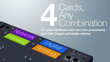 Mais de 30 tipos de cartão Mini-YGDAI podem ser utilizados com o RSio64-D. Não só cartões para entrada/saída que gerem formatos como AES/EBU ou ADAT, mas também cartões de processamento que oferecem capacidades tais como a de processamento Lake ou mistura automática Dan Dugan, entre outras.