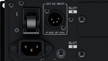 Para além do principal conector AC IN, uma fonte de energia externa de +24V DC pode ser ligada através de um conector XLR-4-32 do tipo EXT DC INPUT, para servir de reserva à fonte de energia principal interna. A entrada de AC principal também apresenta um interruptor tipo V-Lock que ajuda a prevenir um corte de energia acidental.