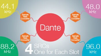 Com quatro cartões MY16-AE AES/EBU instalados, a saída AES/EBU dos receptores de RF pode ser convertida em formato Dante e alimentada para um console da série CL ou QL, enquanto o sinal Dante é convertido em AES/EBU para conexão com amplificadores de potência de entrada digitais. Os conversores de taxa de amostragem são fornecidos para cada um dos slots RSio64-D, de modo que dispositivos que operam em diferentes word clocks podem ser conectados sem causar interrupções de sinal ou aumentar o ruído.