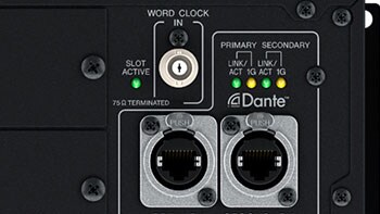 Quatro cartões acopláveis MY8-SDI-ED podem ser instalados nos slots RSio64-D para fornecer conversão bidirecional entre os sinais Dante e HD-SDI/SD-SDI. Os conversores de taxa de amostragem fornecidos para cada slot RSio64-D permitem que dispositivos que operam em diferentes word clocks sejam conectados sem causar interrupções de sinal ou aumentar o ruído.