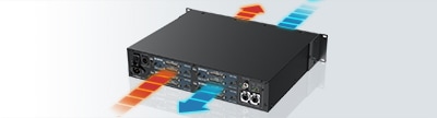 Para além do principal conector AC IN, uma fonte de energia externa de +24V DC pode ser ligada através de um conector XLR-4-32 do tipo EXT DC INPUT, para servir de reserva à fonte de energia principal interna. A entrada de AC principal também apresenta um interruptor tipo V-Lock que ajuda a prevenir um corte de energia acidental.