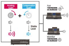 Um inconveniente óbvio de ligar várias mesas de mistura a uma única unidade de bastidor E/S é que os acertos de ganho feitos a partir de uma dessas mesas pode causar alterações inesperadas no ganho, nas outras mesas de mistura. A função de Compensação de Ganho, implementada nas mesas de mistura da Série CL, assegura que quando a fase analógica de ganho é ajustada a partir de uma das mesas de mistura, seja automaticamente aplicada a compensação correspondente na fase digital, de modo a que o nível enviado da unidade de bastidor E/S para as mesmas de mistura CL ligadas se mantenha constante.