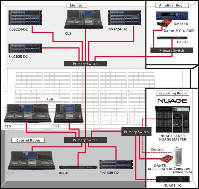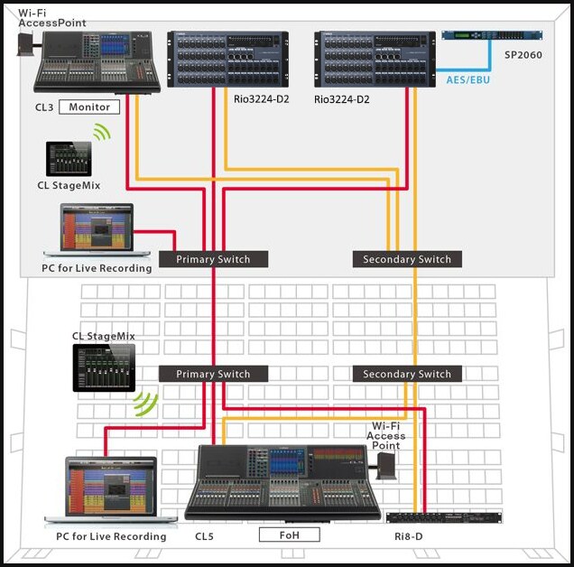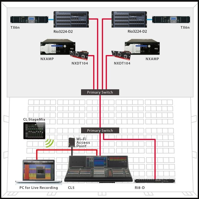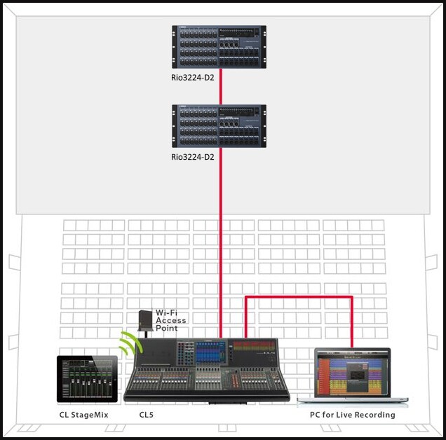 Os switches de portas internas permitem que os consoles CL sejam facilmente configurados para configurações de rede em cascata ou estrela. Neste exemplo, o console na posição FOH está diretamente conectado ao rack de I/O ao lado do palco. A rede é autoconfigurada. Claro que o aplicativo de iPad CL StageMix pode ser usado mesmo em sistemas simples como este, e a placa de som virtual Dante pode ser usada para habilitar a gravação multipista em uma DAW, como Nuendo da Steinberg.
