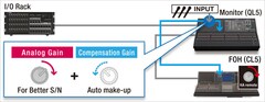 A capacidade de se conectar diretamente das portas de entrada para as portas de saída, sem passar por canais de mixagem, proporciona uma liberdade sem precedentes para o roteamento de sinais entre o analógico, Dante, e minhas entradas e saídas de slots. Por exemplo, um console QL poderia ser utilizado como um dispositivo de I / O para outro console série QL ou CL, ao mesmo tempo em que funciona como um console de monitor. Não só é apenas um console QL necessário para monitorar e utilizar o I / O, mas os ganhos analógicos também podem ser controlados remotamente a partir da QL em FoH ou console CL. Também é possível misturar os sinais analógicos recebidos no console enquanto se transmite para um sistema de gravação multitrack via Dante, por exemplo. As possibilidades são vastas.
