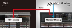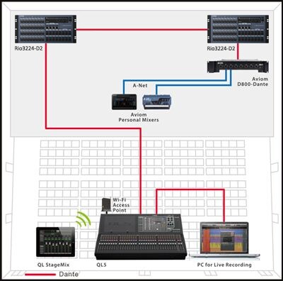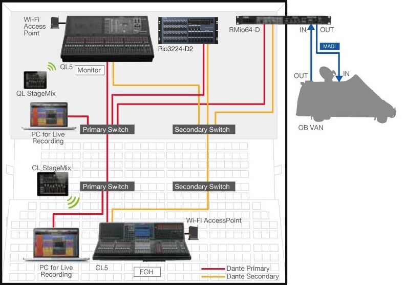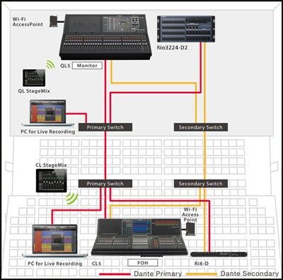 Neste sistema de som ao vivo compacto, mas eficiente, um console da série CL está na FoH, enquanto um console QL do lado do palco funciona como um console de monitor e também como um I/O rack graças à sua capacidade Port to Port. A função de compensação de ganho significa que o aumento do pré-amplificador pode ser controlado com segurança de qualquer console sem interferência. Para obter a máxima confiabilidade do sistema, uma configuração de rede em estrela com switches de rede é usada para redundância, de modo que um problema em uma parte da rede não interrompa o fluxo geral do sinal, a gravação ao vivo em vários computadores também é possível.