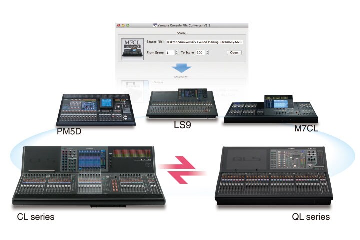 Uma vez que os dados da mixagem da série QL e CL são compatíveis, os dados criados em qualquer um dos consoles podem ser lidos instantaneamente e utilizados por outro. O tempo e esforço dedicados à criação de dados de mixagem para um trabalho pode ser transferido para outras aplicações. Além disso, o aplicativo conversor de arquivos dos consoles Yamaha fornece compatibilidade com consoles PM5D, M7CL e LS9 também. Todos os dados que você, cuidadosamente trabalhou, podem ser utilizados em situações futuras.