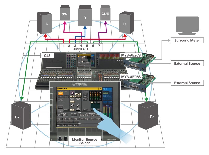 As fontes surround externas podem ser enviadas ao console através de um slot de expansão Mini-YGDAI para que as fontes possam ser trocadas e monitoradas através do console. Os sinais surround também podem ser enviados a um medidor surround externo através de um slot Mini-YGDAI.