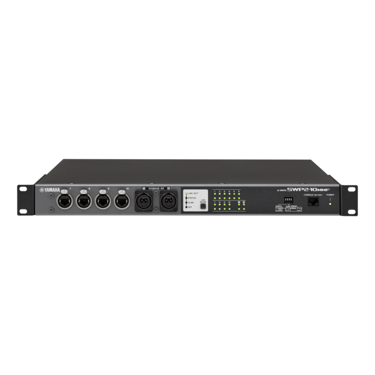 O switch L2 da série SWP1 é ideal para sistemas de rede Dante. Ele possui oito portas etherCON, uma porta opticalCON e um slot opcional para mais uma porta, conforme necessário.