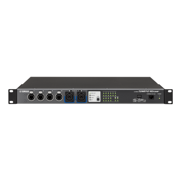 O switch L2 da série SWP2 é ideal para sistemas de rede Dante 96kHz. Ele possui 10 portas etherCON e duas portas de fibra óptica de modo únicoCON.