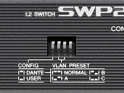 As redes Dante simples não são difíceis de configurar e operar, mas, conforme a complexidade da rede aumenta, os switches usados precisam ser otimizados para a operação do Dante, a fim de obter o máximo de estabilidade. A configuração de QoS, IGMP Snooping e outros parâmetros em um switch inteligente pode ser uma tarefa complexa, exigindo conhecimento especializado que é mais do domínio dos técnicos de TI do que dos engenheiros de áudio. A série SWP2 permite que uma configuração otimizada do Dante seja recuperada simplesmente girando uma chave DIP. Não é necessário conhecimento ou treinamento.