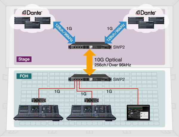 A série SWP2 equipa as portas ópticas de uplink de 10G, permitindo a operação sem medo de largura de banda insuficiente, mesmo em uma rede Dante definida para uma frequência de amostragem de 96 kHz. É uma solução dimensionável que cresce com um sistema de rede Dante de 96kHz com um grande número de canais.