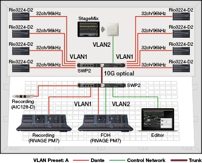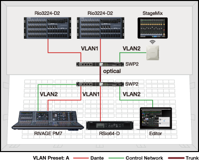 Nesse caso, é utilizada a VLAN Preset A, em que a VLAN1 lida com a rede Dante, enquanto a VLAN2 hospeda sinais de controle, como o Editor ou o StageMix, dos sinais de áudio do Dante, tornando a rede mais estável.