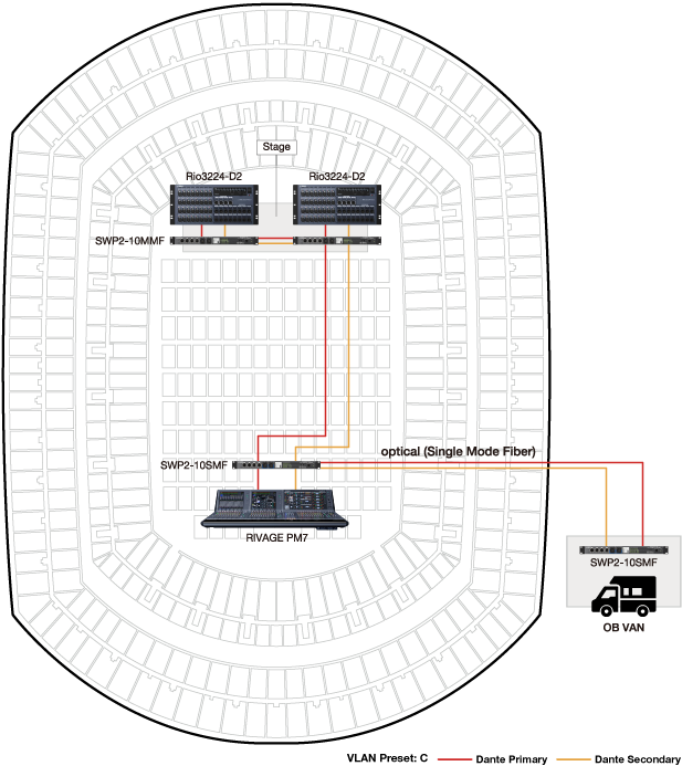 Neste exemplo, a predefinição de VLAN C foi configurada nos switches SWP2-MMF e SWP2-SMF, com a linha primária Dante atribuída à VLAN1 e a linha secundária atribuída à VLAN2. A conexão de fibra óptica de modo único entre os switches permite a transmissão confiável de dados em distâncias de até 10 mil metros.