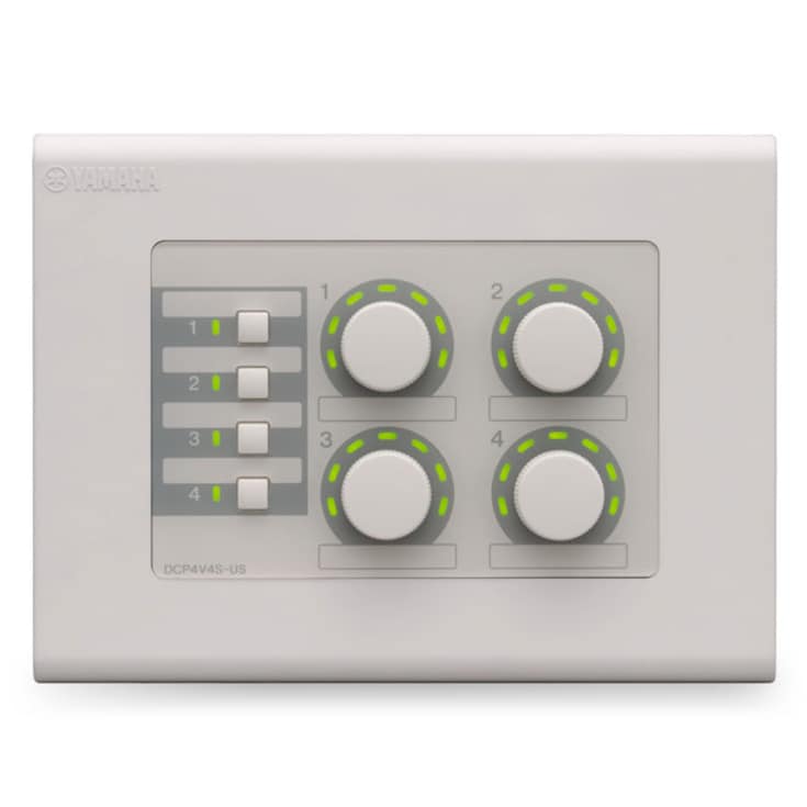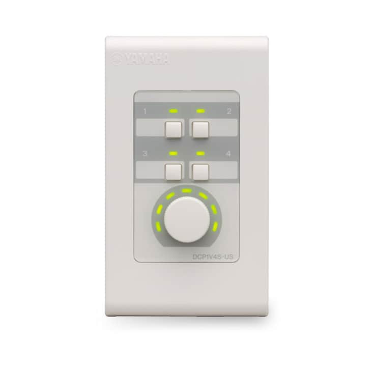 Painel de controle com montagem em parede equipado com 1 volume e 4 interruptores para as séries DME7, MTX/MRX e MA/PA. Fácil conexão por cabo CAT5 carregando RS485 + alimentação. No máximo 8 DCPs podem ser conectados a 1 série DME7 e MTX/MRX. 1 DCP1V4S pode ser conectado a 1 MA2030a/MA2030. No máximo 2 DCPs podem ser conectados a 1 MA2120 ou PA2120.