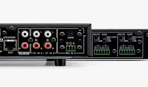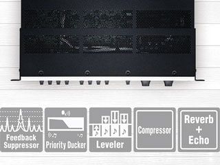 Misturador de som com amplificador e processamento digital Classe-D alternável entre Baixa e Alta Impedância (Baixa/Lo-Z : 120W x2 @4Ω, 100W x2ch @3Ω/8Ω, Alta/Hi-Z: 120W x2ch ou 200W x1ch, 70V/100V) equipados com entradas de 6 microfones/linha, 2 entradas estéreo e funções profissionais de DSP para reprodução de música de alta qualidade e uso do microfone.