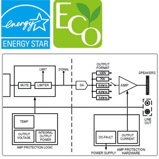 - Suporte a sistemas de alto falante Lo-Z (30W @ 3Ω/4Ω/8Ω) e Hi-Z (60W x1ch, 70V/100V)
