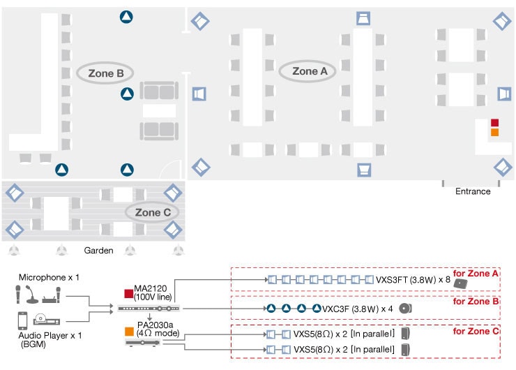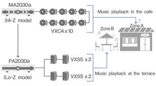Esta figura mostra um sistema que seria ideal para um restaurante com bar e área de terraço. O MA2120 está configurado para dirigir linhas de 100 volts, alimentando um total de 8 alto falantes de montagem em superfície VXS3FT através de seus taps de transformador de 3,8W, bem como 4 alto falantes de teto VXC3F. O MA2120 pode fornecer diferentes fontes em diferentes volumes na respectiva zona. O PA2030a na conexão de Baixa Impedância de modo 4Ω gerencia um total de 4 alto falantes de montagem em superfície VXS5 em paralelo, fornecendo o mesmo BGM em nível superior.